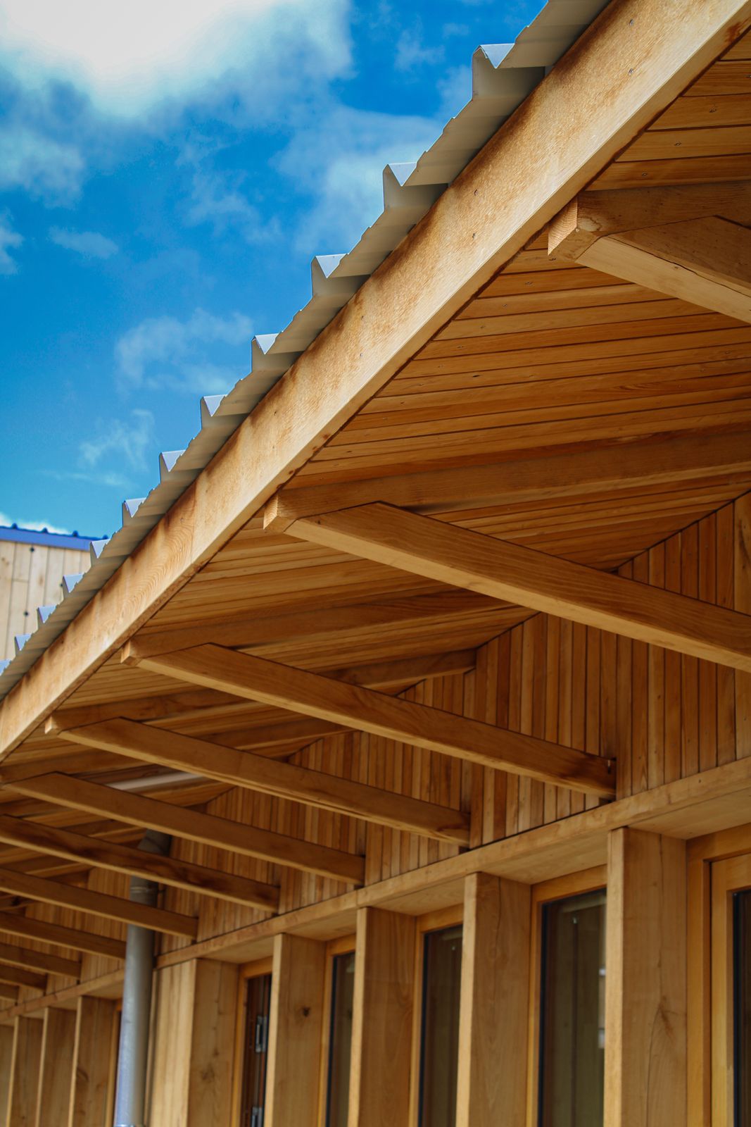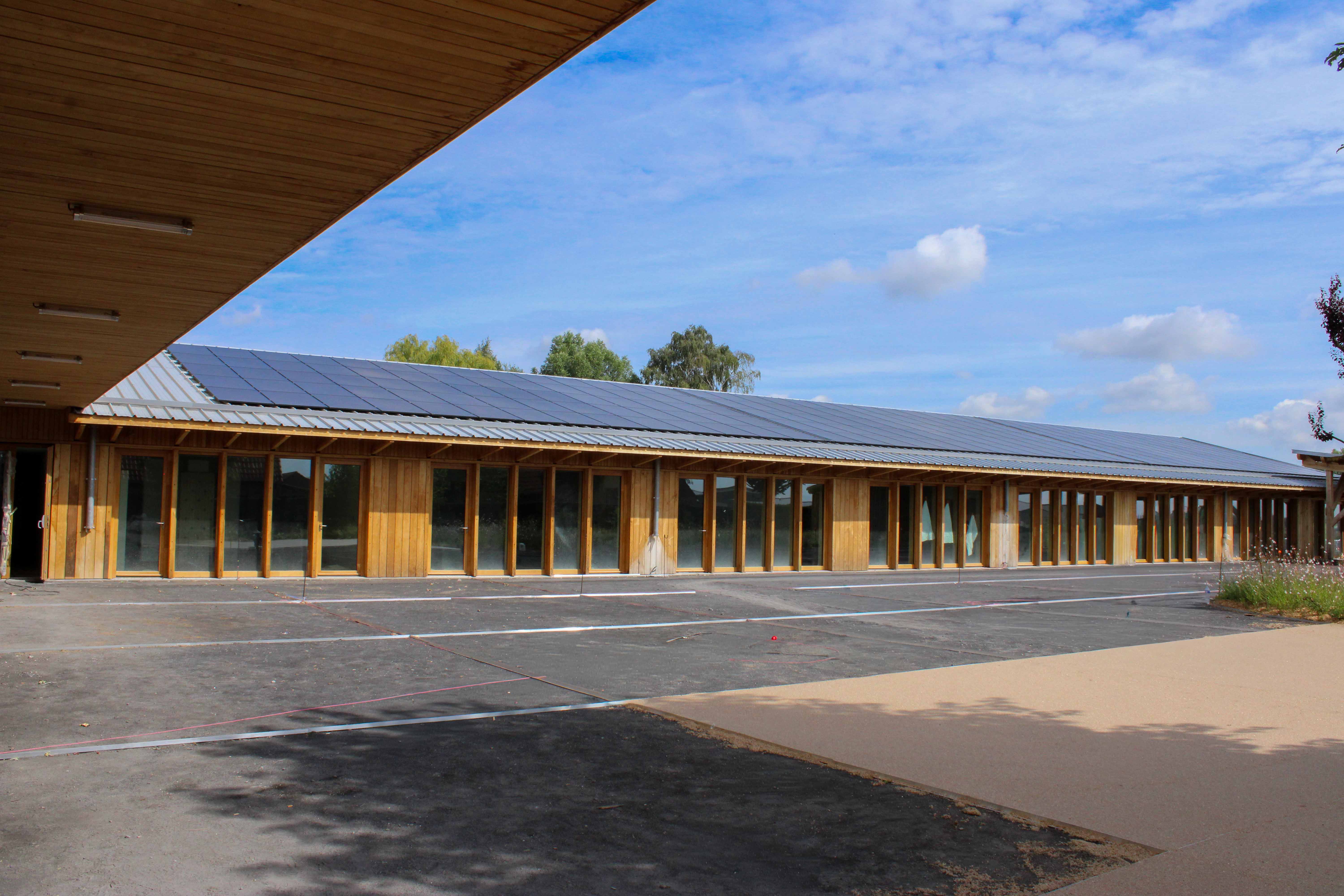 Notre équipe a eu le privilège de contribuer à ce projet en réalisant la structure bois de ces deux bâtiments mêlant, charpente en peuplier et épicéa murs ossature bois, caissons ossature bois, préau chêne et bardage en châtaigner: